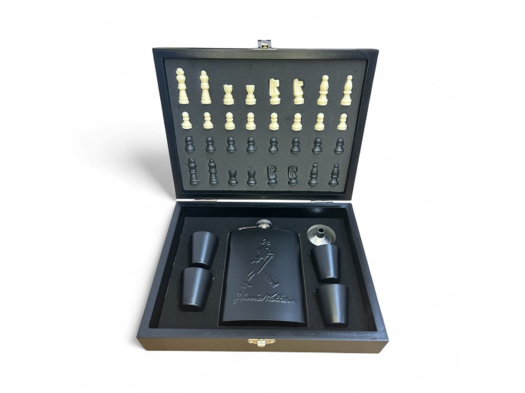 Dárkové balení placatky Johnnie Walker s šachovou soupravou. Balení obsahuje Placatku Johnnie Walker, 4 panáky, nálevku a šachovou desku.