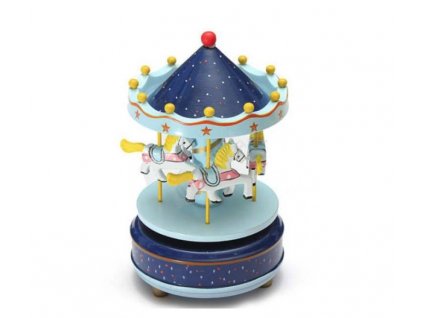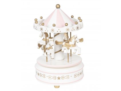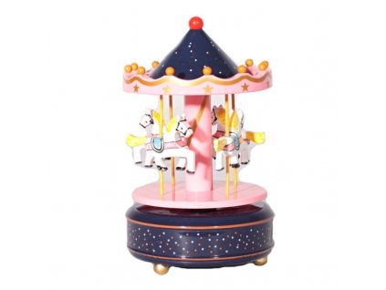 Kolotoč je vybavený původním hracím strojkem, který se rozehraje po natažení pérka. Natahování strojku jde zlehoučka a vaše děti si s ním hravě poradí. Po natažení se rozezní melodie a kolotoč se začne zvolna otáčet. Koníčky na tyčkách kolotoče můžete pohybovat kolem své osy.