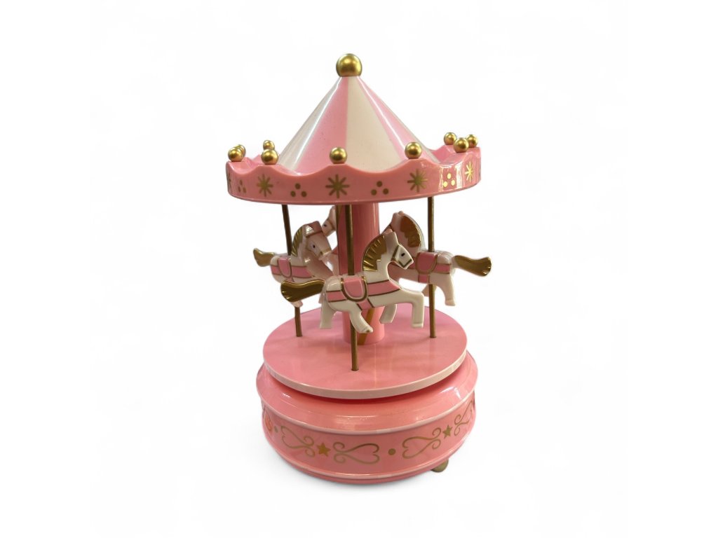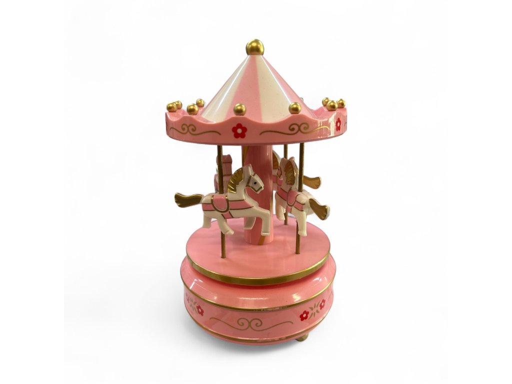Kolotoč je vybavený původním hracím strojkem, který se rozehraje po natažení pérka. Natahování strojku jde zlehoučka a vaše děti si s ním hravě poradí. Po natažení se rozezní melodie a kolotoč se začne zvolna otáčet. Koníčky na tyčkách kolotoče můžete pohybovat kolem své osy.
