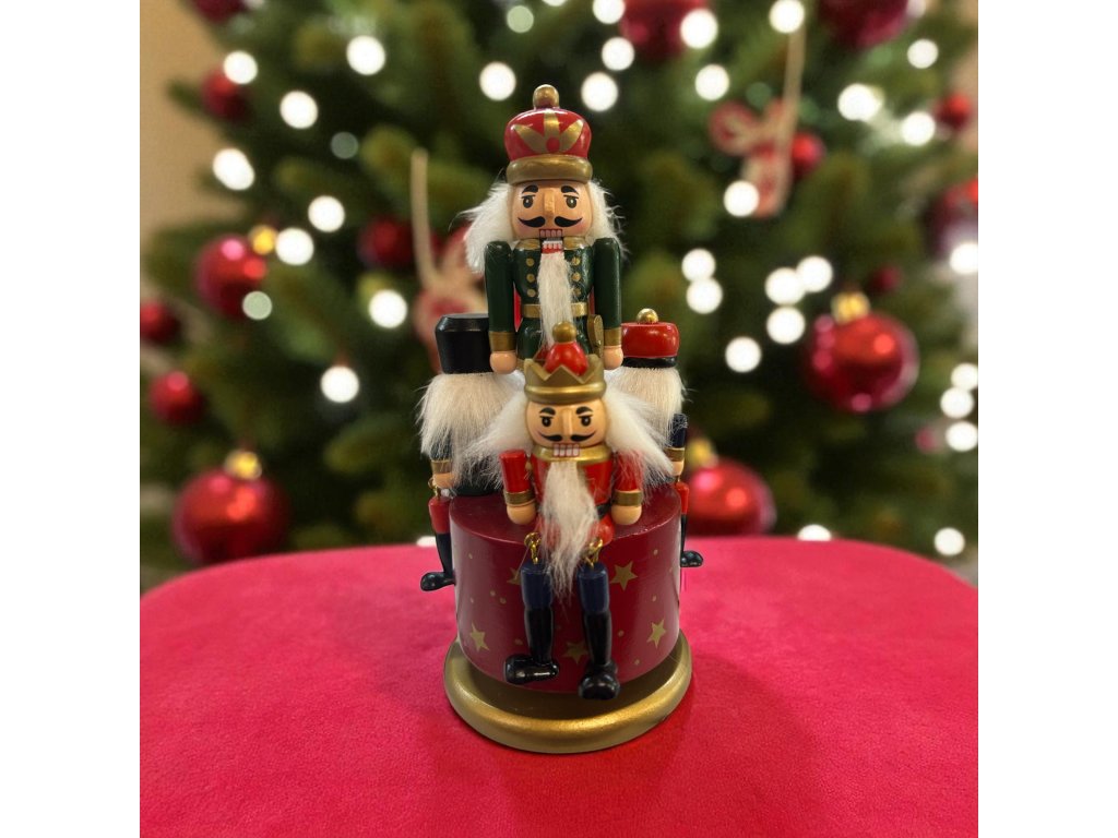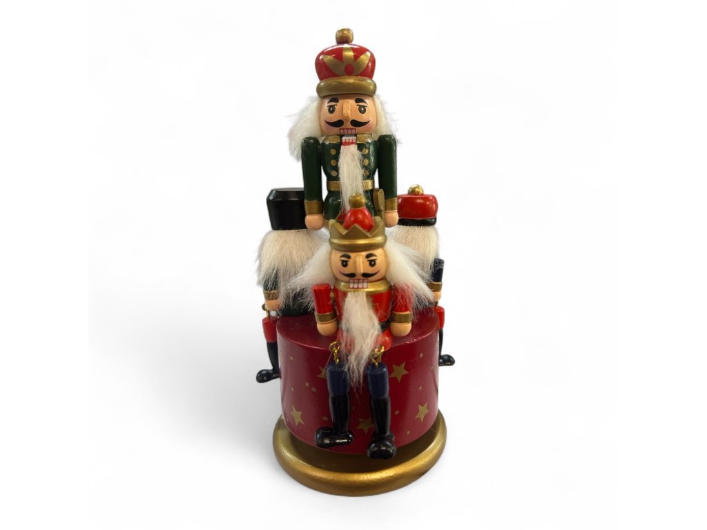 Krásný hudební kolotoč s louskáčky. Pokud jemně otočíte horní částí produktu, abyste jej navinuli, začne přehrávat hudbu, když se otáčí a zobrazuje všechny figurky na karuselu. Velmi dekorativní a s detailními louskáčky.