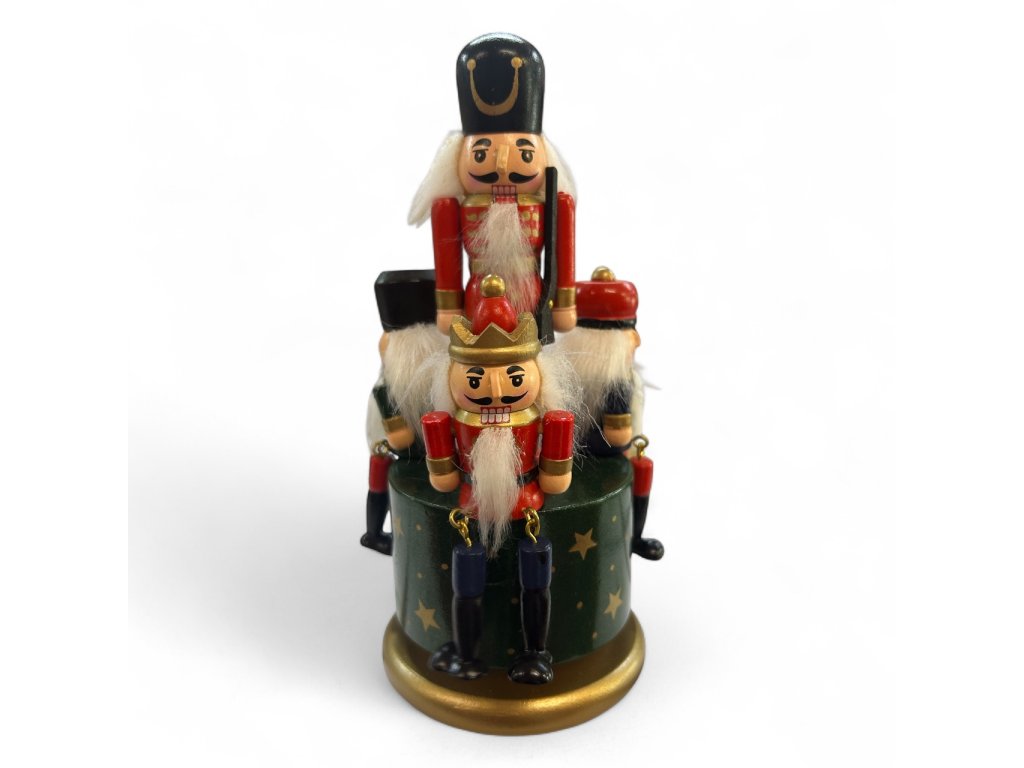 Krásný hudební kolotoč s louskáčky. Pokud jemně otočíte horní částí produktu, abyste jej navinuli, začne přehrávat hudbu, když se otáčí a zobrazuje všechny figurky na karuselu. Velmi dekorativní a s detailními louskáčky.