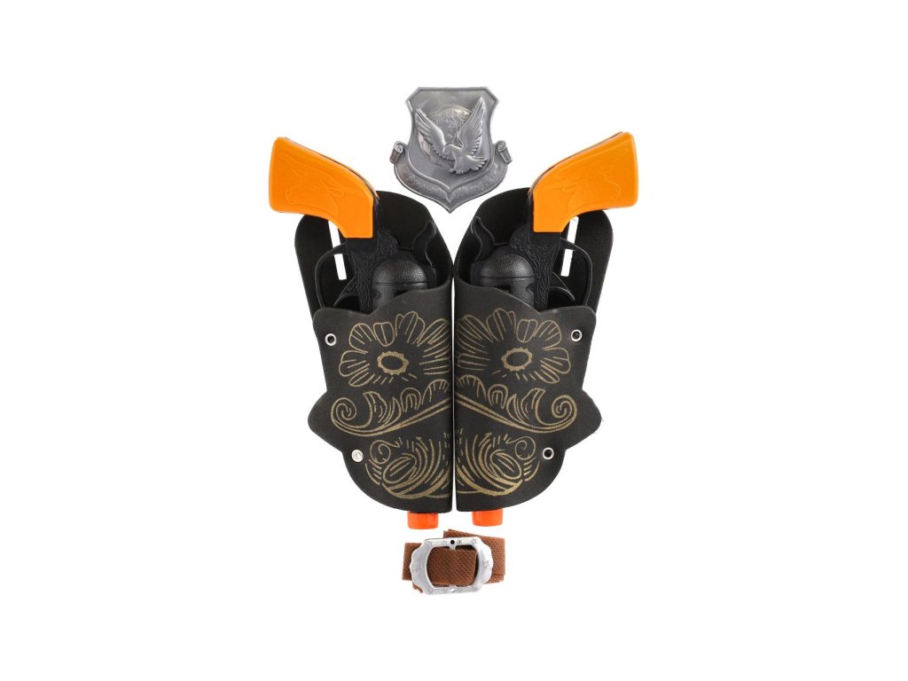 Staňte se hrdinou Divokého západu! Tato kovbojská sada obsahuje 2 plastové pistole s elegantními pouzdry, odznak šerifa a nastavitelný opasek pro autentické převleky a fantazijní hry.