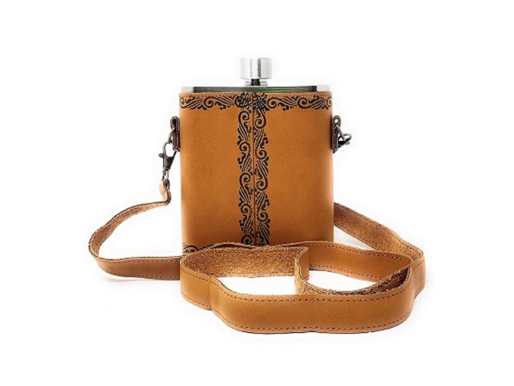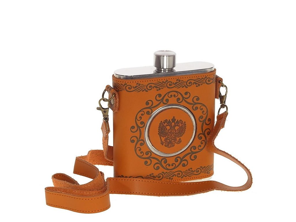 Stylová nerezová placatka o objemu 530 ml v koženém pouzdře se znakem České Republiky.