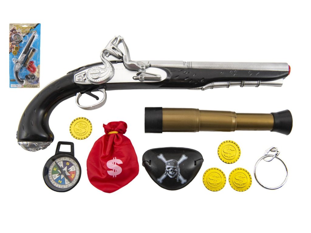Obsah balení: dětská zbraň, dalekohled, pirátská páska na oko, kompas, měšec na dětské peníze, zlaťáky 4ks, náušnice