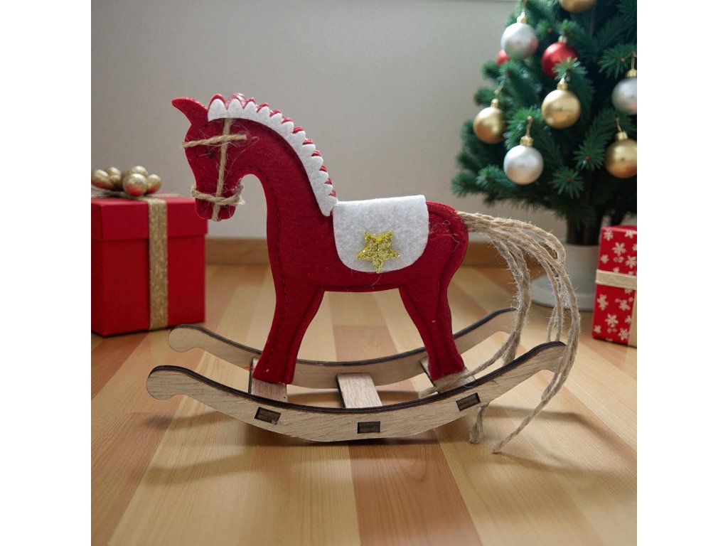 Tento kouzelný houpací kůň z plsti jako dekorace k postavení připomíná dřívější doby a i v dnešní době upoutá pozornost. Dekoraci můžete ozdobit vánočními větvičkami a vánočními koulemi a zaručeně se bude dobře vyjímat například na komodě nebo příborníku.