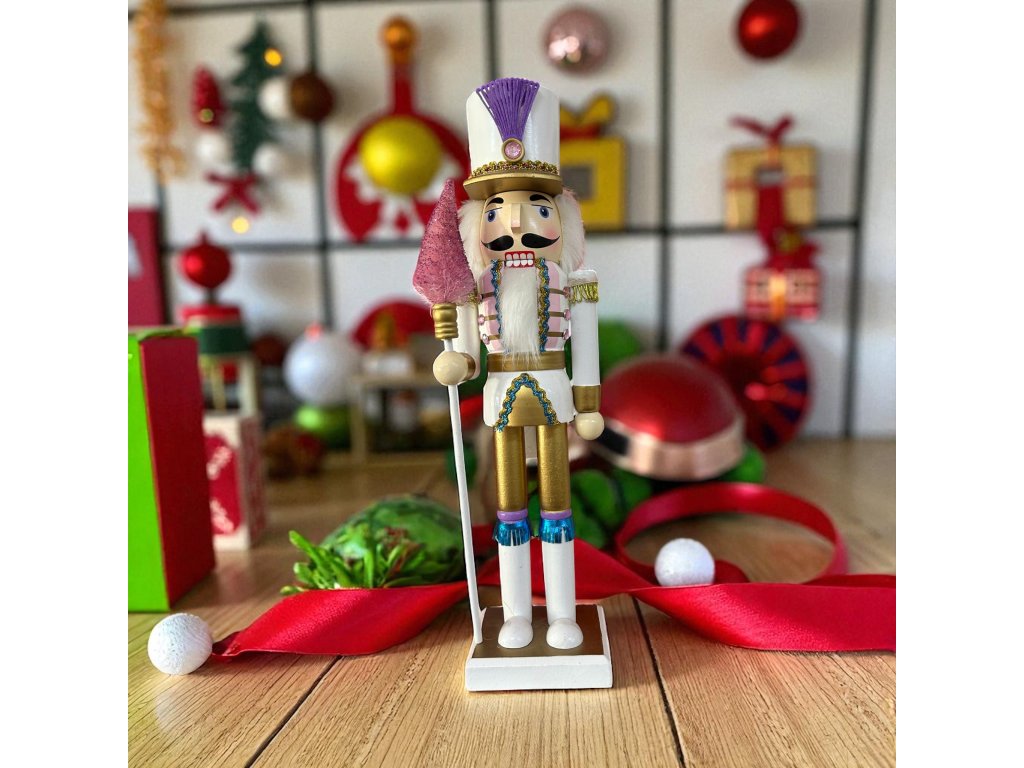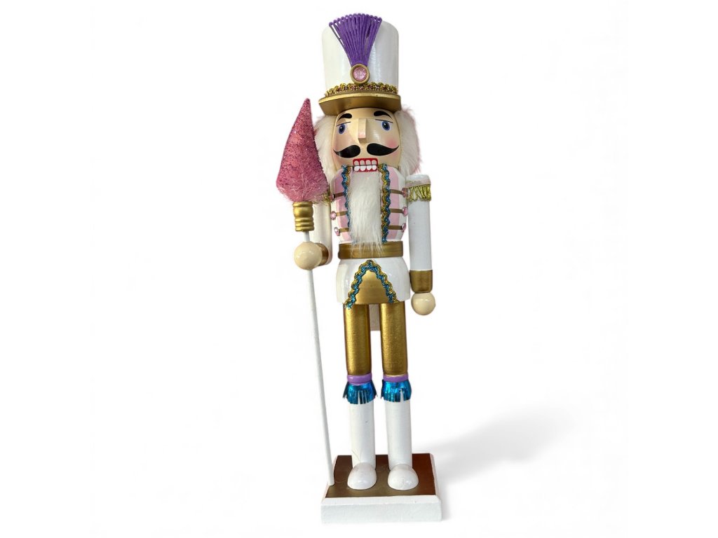 Vánoční dekorace louskáček - Bílo-zlatý s růžovou holí (40 cm)