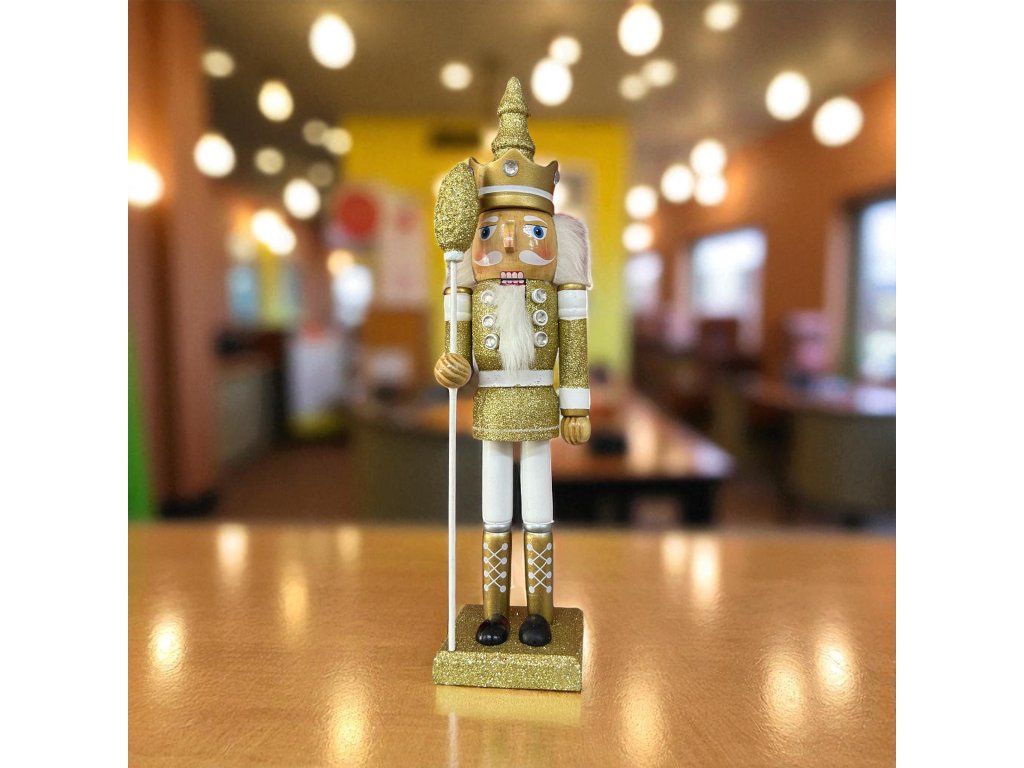 Vánoční dekorace louskáček - Zlato-bílý třpytivý s holí (40 cm)