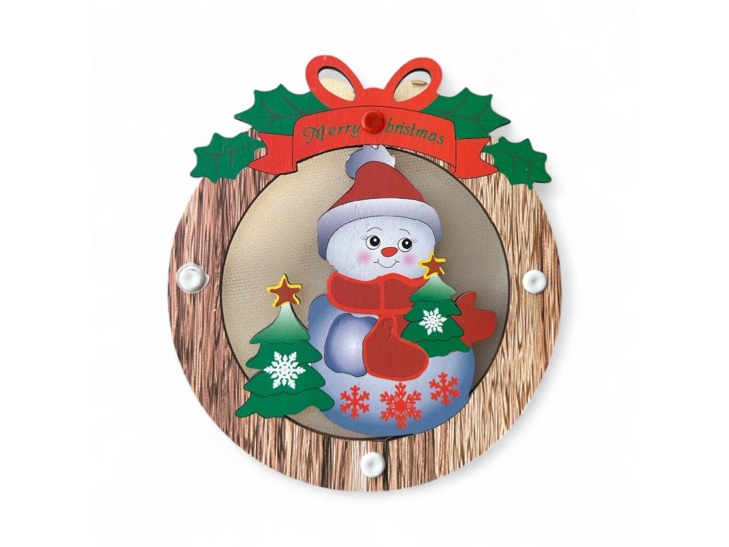 Vánoční dřevěná ozdoba s LED osvětlením - Sněhulák (koule)