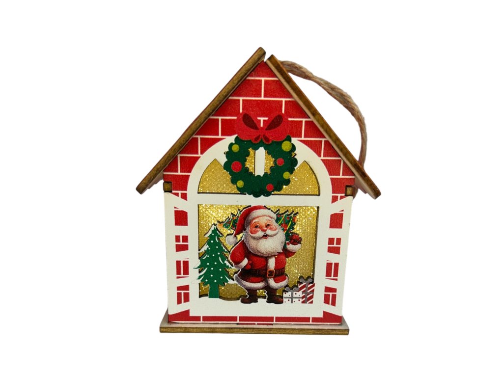 Vánoční LED závěsná dekorace na zavěšení - Domeček se Santa Clausem (8x9x7 cm)